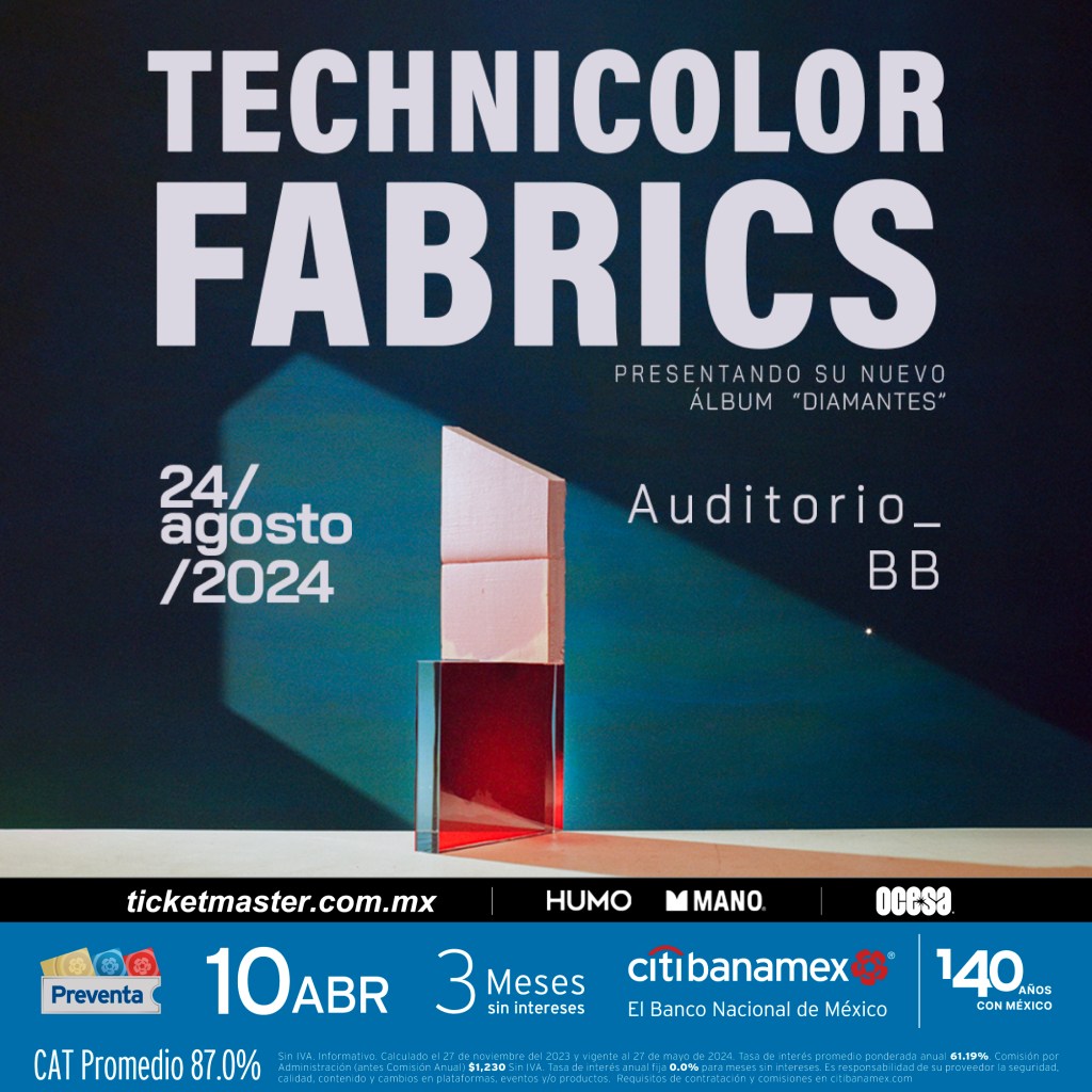 El evento en el Auditorio BB promete ser una noche inolvidable para los fans de Technicolor Fabrics, quienes podrán disfrutar en vivo de Diamante y de la energía que la banda siempre transmite en cada una de sus presentaciones. Los boletos ya están disponibles en preventa a través de Citibanamex, y la venta general se llevará a cabo a través de Ticketmaster.