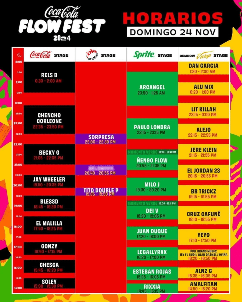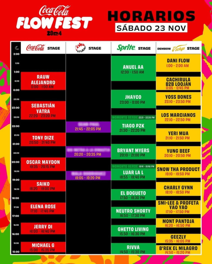 El Coca-Cola Flow Fest 2024 está a punto de invadir la Ciudad de México con el mejor reguetón del momento, y ahora ya puedes empezar a planear tu experiencia porque ¡los horarios oficiales del festival ya están disponibles! Este evento, que se llevará a cabo los próximos 23 y 24 de noviembre en el Autódromo Hermanos Rodríguez, promete una dosis masiva de perreo, bellakeo y pura energía urbana, con un line-up de lujo que incluye a grandes exponentes del reguetón como Rauw Alejandro, Becky G, Chencho Corleone y muchos más.