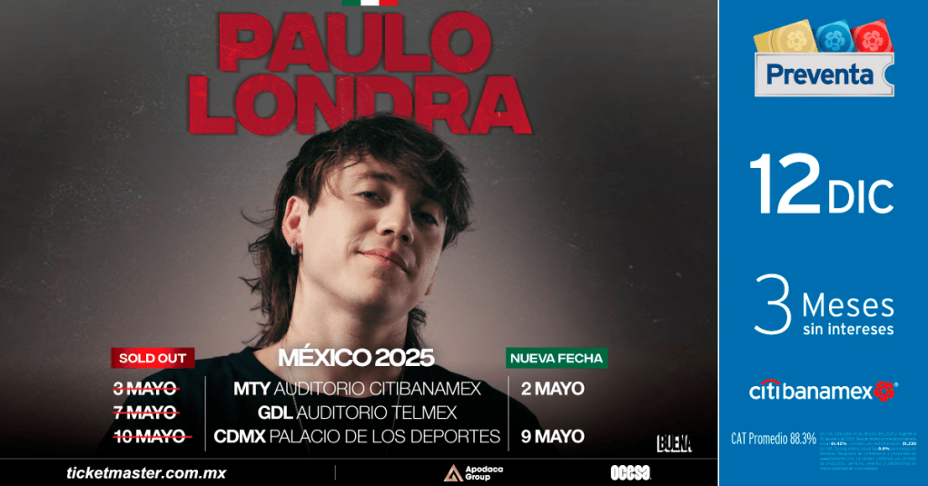 El fenómeno argentino del rap y el trap, Paulo Londra, ha dejado claro que su conexión con el público mexicano está más viva que nunca. En cuestión de horas, el artista agotó todas las entradas para sus conciertos programados en mayo de 2025 en Monterrey, Guadalajara y Ciudad de México, lo que ha llevado a la incorporación de dos nuevas fechas: 2 de mayo en Monterrey (Auditorio Citibanamex) y 9 de mayo en la Ciudad de México (Palacio de los Deportes). La venta general de boletos comenzó este viernes 13 de diciembre a las 11:00 a.m. a través de Ticketmaster.