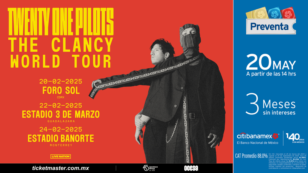 Twenty One Pilots se presentará en CDMX este 20 de febrero en el Estadio GNP y en Monterrey este 24 de febrero en el Estadio Banorte para ofrecer un reencuentro único con su público regio y cantar los mejores éxitos hasta lo más nuevo acompañados de su público.