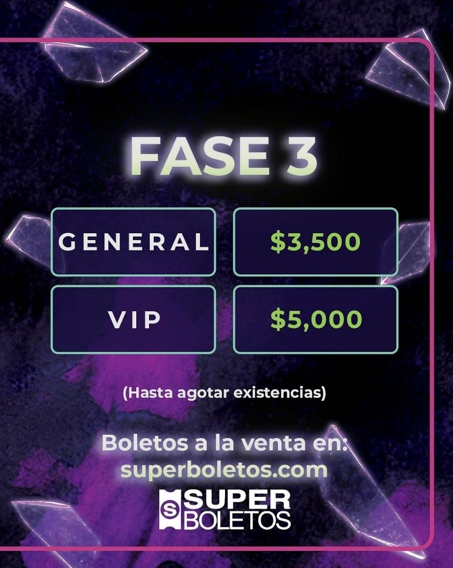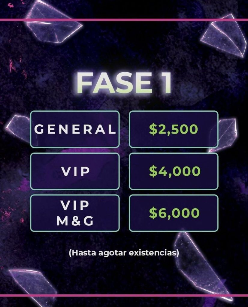 VIP: Acceso a grada techada, baños exclusivos, barra y alimentos exclusivos. Incluye una playera conmemorativa y participa para ganar M&G (bandas por confirmar). Acceso a zona general.