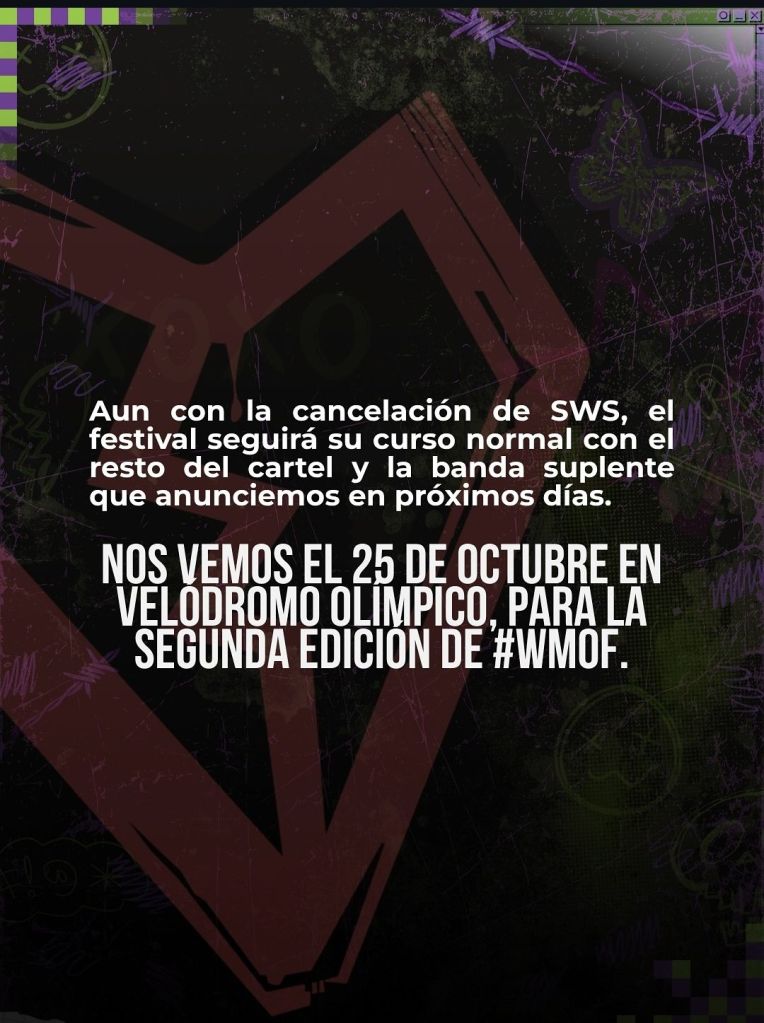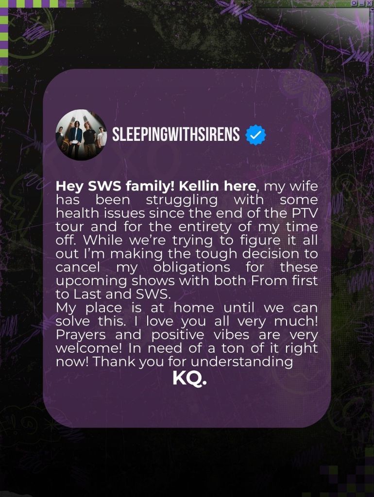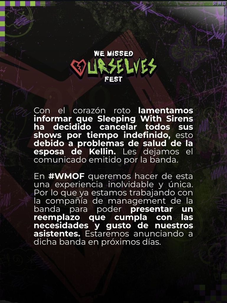Sleeping With Sirens, una de las bandas más esperadas en este festival anuncia su baja del cartel a tan sólo un mes del evento. De acuerdo al comunicado oficial por parte de la agrupación, debido a la situación delicada de salud por la que pasa la esposa del vocalista Kellin Quinn tuvieron que cancelar varias fechas de forma indefinida.