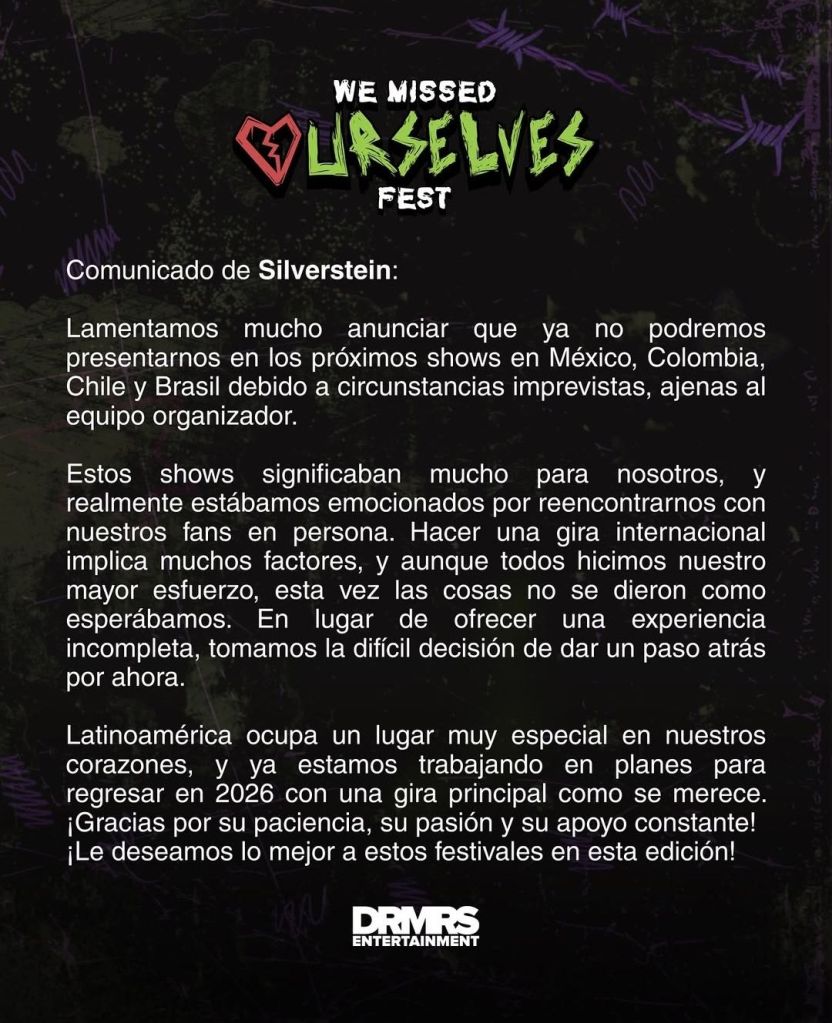 La banda anunció que tristemente cancelarán sus fechas en Latinoamérica por cuestiones ajenas a la organización, muchos lo consideraron una falta de respeto y poco profesionalismo por parte de Silverstein.