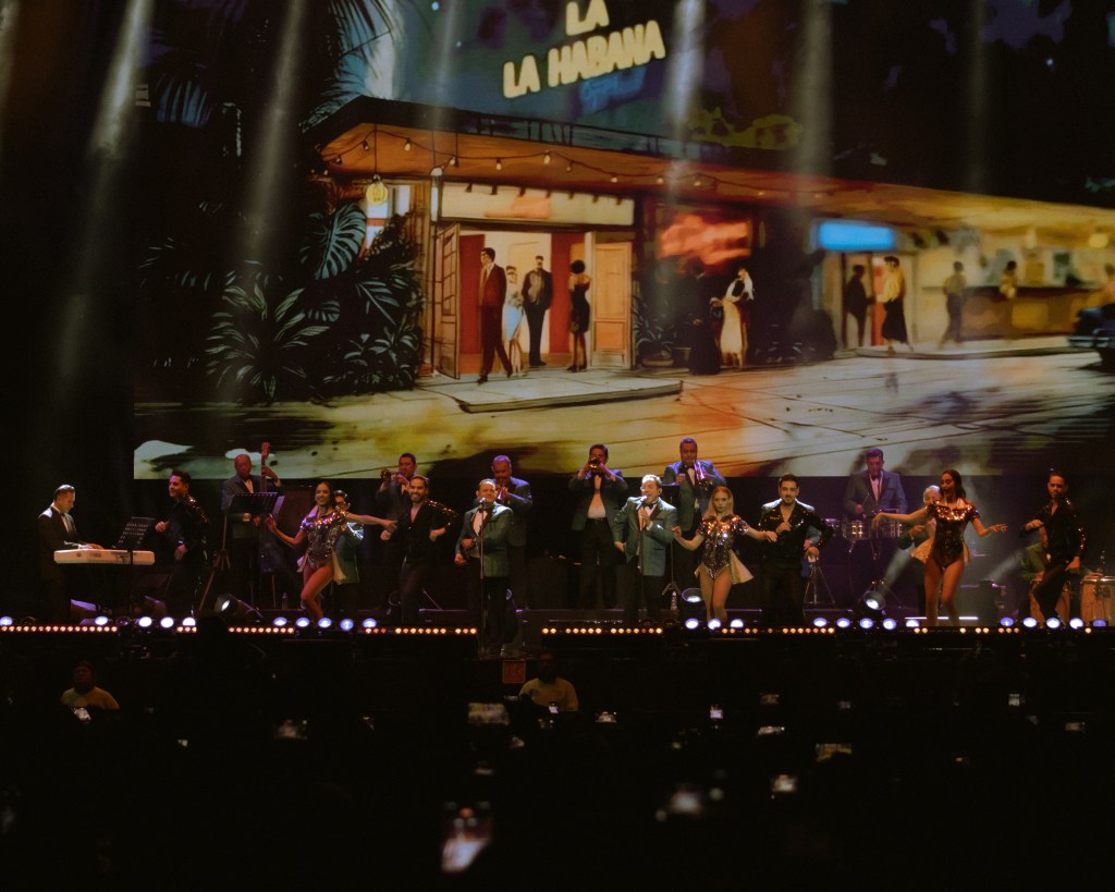 La producción del concierto estuvo a la altura de la ocasión: iluminación espectacular, pantallas con imágenes históricas y arreglos especiales que dieron un aire renovado a los temas clásicos sin perder su carácter romántico y bailable.