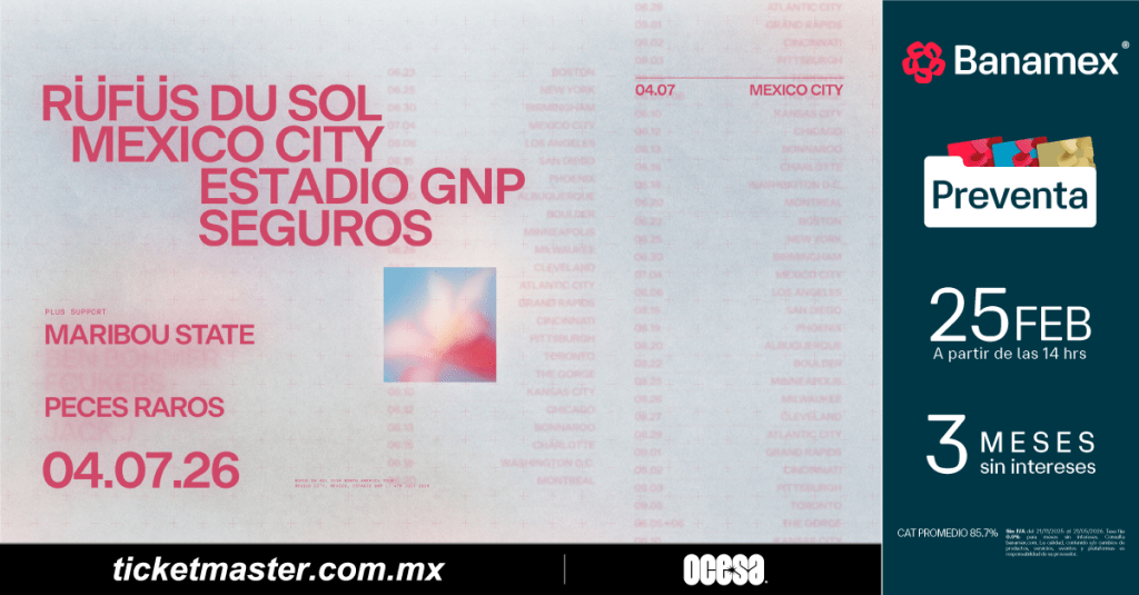 El 17 de febrero de 2026, el trío australiano RÜFÜS DU SOL confirmó su regreso a Norteamérica con la que será la gira más ambiciosa de su carrera como acto principal en la región. Tras un 2025 histórico con una gira global que rompió récords y agotó entradas alrededor del mundo, la banda llevará su potente espectáculo en vivo a estadios y recintos emblemáticos, incluyendo una esperada parada el 4 de julio en el Estadio GNP Seguros de la Ciudad de México.